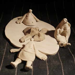 Made the Sauna gang inspired by/responding to her aesthetic and creative process shortly after our video chat. I started off with the old lady (bottom row middle) wanting to make her as a chopstick stand, didn't really want her to be naked so make towels wrapping around her and her head, but then I had an excess slab and the sauna narrative came out of it, so i carved the wave and made more sauna people from then. They are really tiny so were draining to make, spent around two evenings to finish but i really enjoy the outcome.